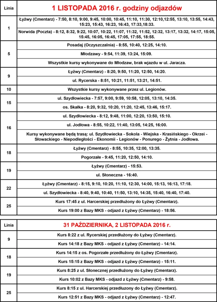 Dnia 31 października oraz 2 listopada autobusy Miejskiej Komunikacji Samochodowej kursują według rozkładu jazdy obowiązującego w dni robocze. Dodatkowo, część kursów zostanie przedłużona do Łyżwy (Cmentarz), zgodnie z dołączonym harmonogramem.